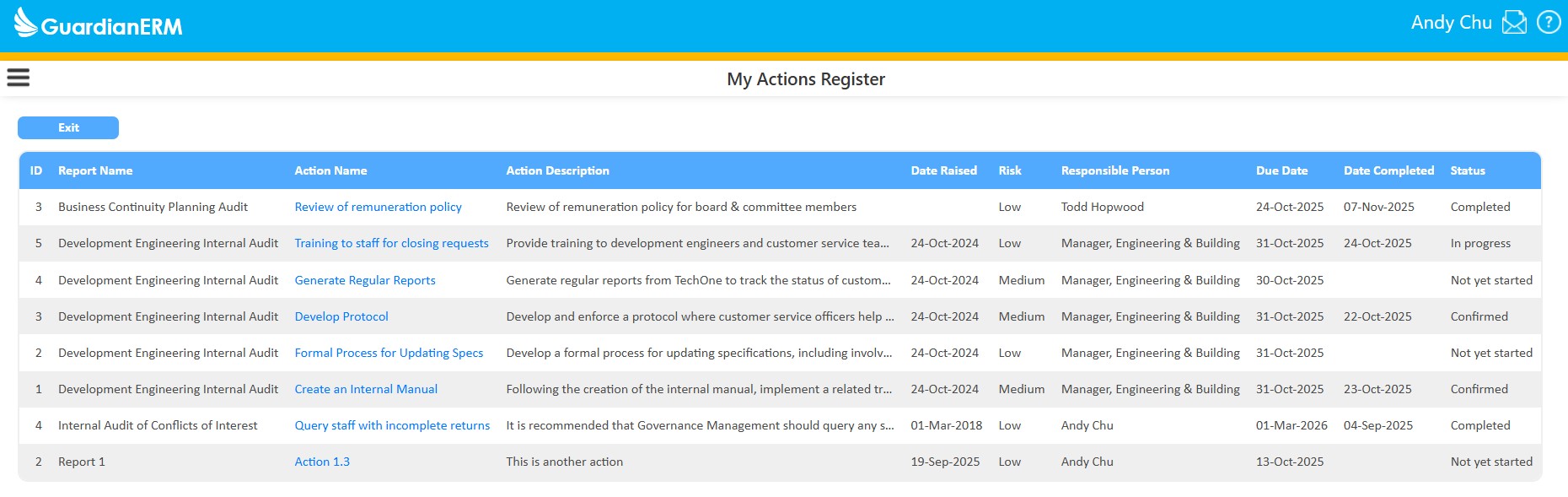 A user with the role of "Actioner" has a simple view and functionality as shown in the screenshot below: