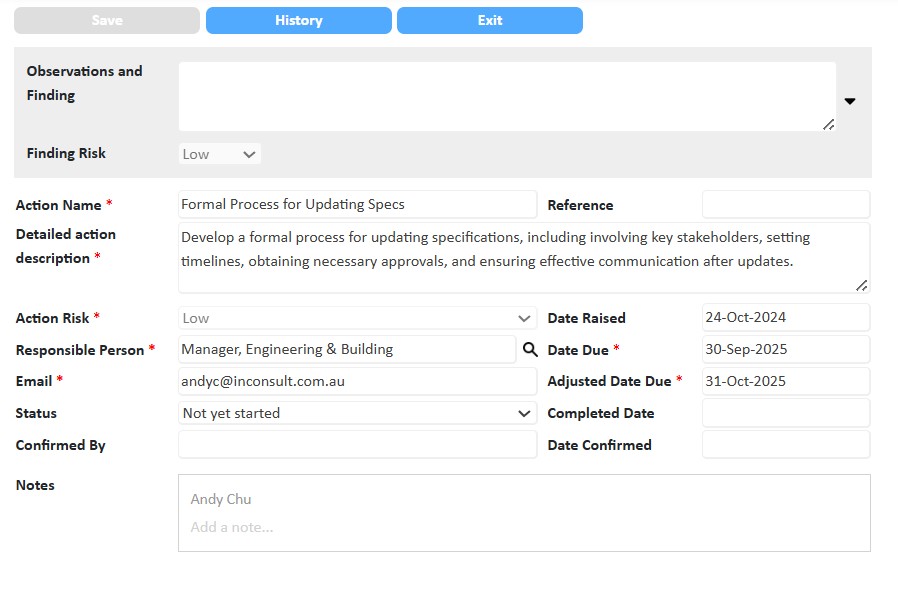 Purpose: This page details the functionality of a user with the role of Actioner. This is the only screen an actioner can view and edit (I.e. they only have access to actions that they are allocated as the responsible owner).