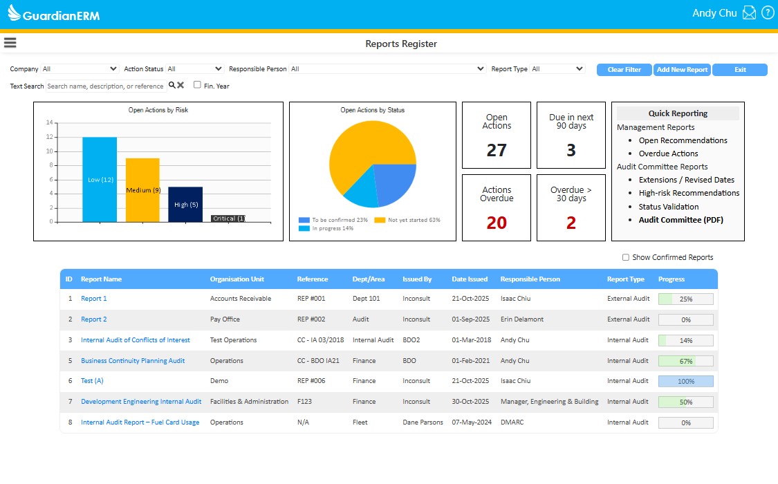 This screen is the main dashboard for managing all your outstanding audit actions and recommendations. The main capabilities within this screen are as follows:
